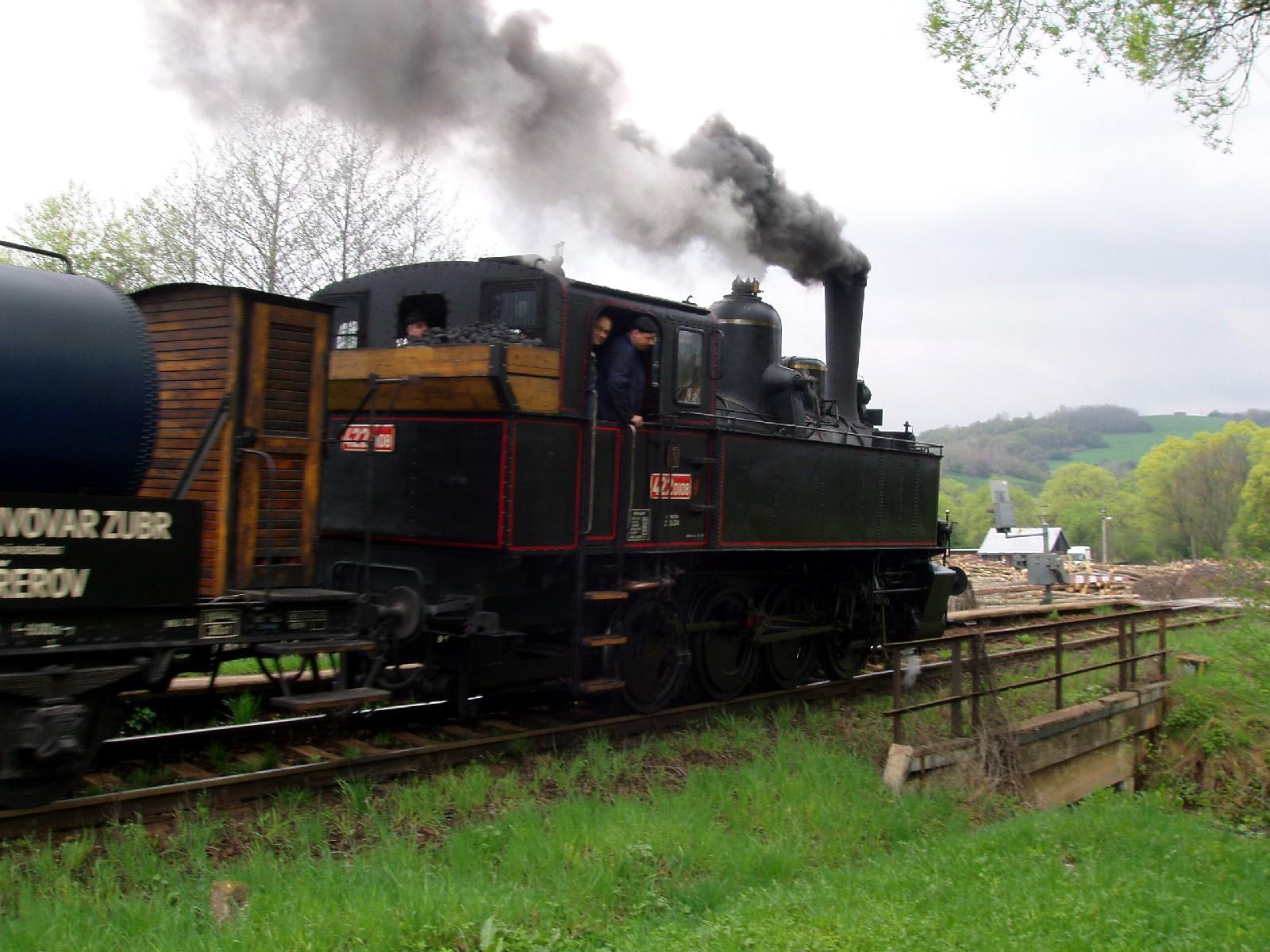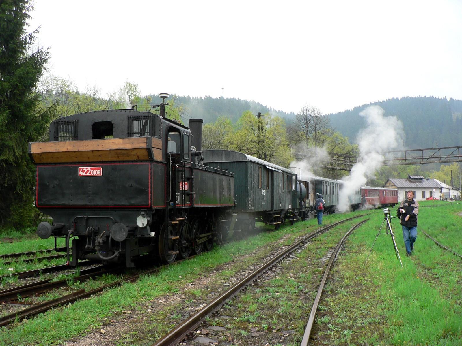 Inak tomu nebolo ani v pondelok 1.5.2006, kedy sa spolu s cisternou ZUBR, servisným vozňom, dvomi osobnými vozňami Ci, bufetom CDLm a motorovým vozňom M 131.1053 v meste pod Urpínom znovu objavil fučiaci "Býček" 422.0108.