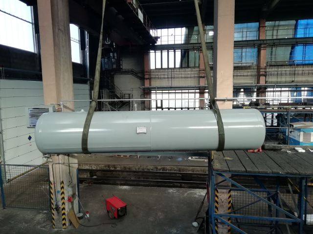 atypický, 2,5m dlhý hlavný vzduchojem vyrobený vo firme ZASTROVA a.s bude o pár okamihov vložený do rušňa T 678.012