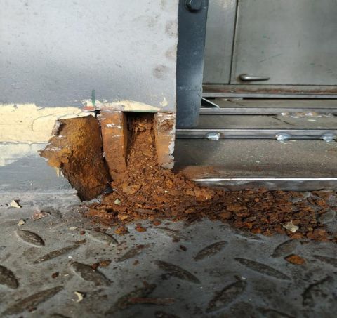 Detail poškodenia zárubne dverí na stanovište rušňovodiča.