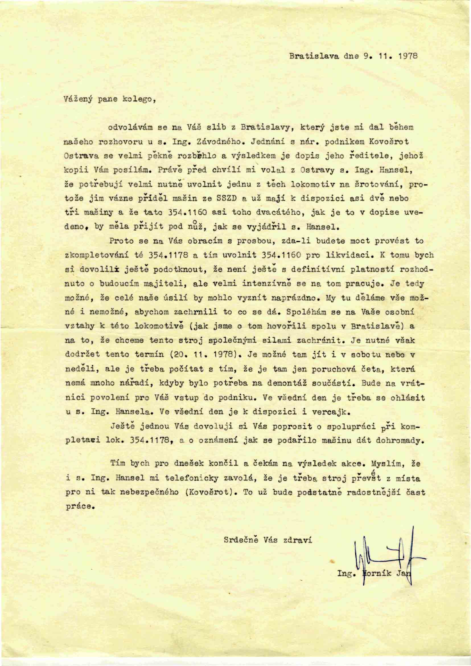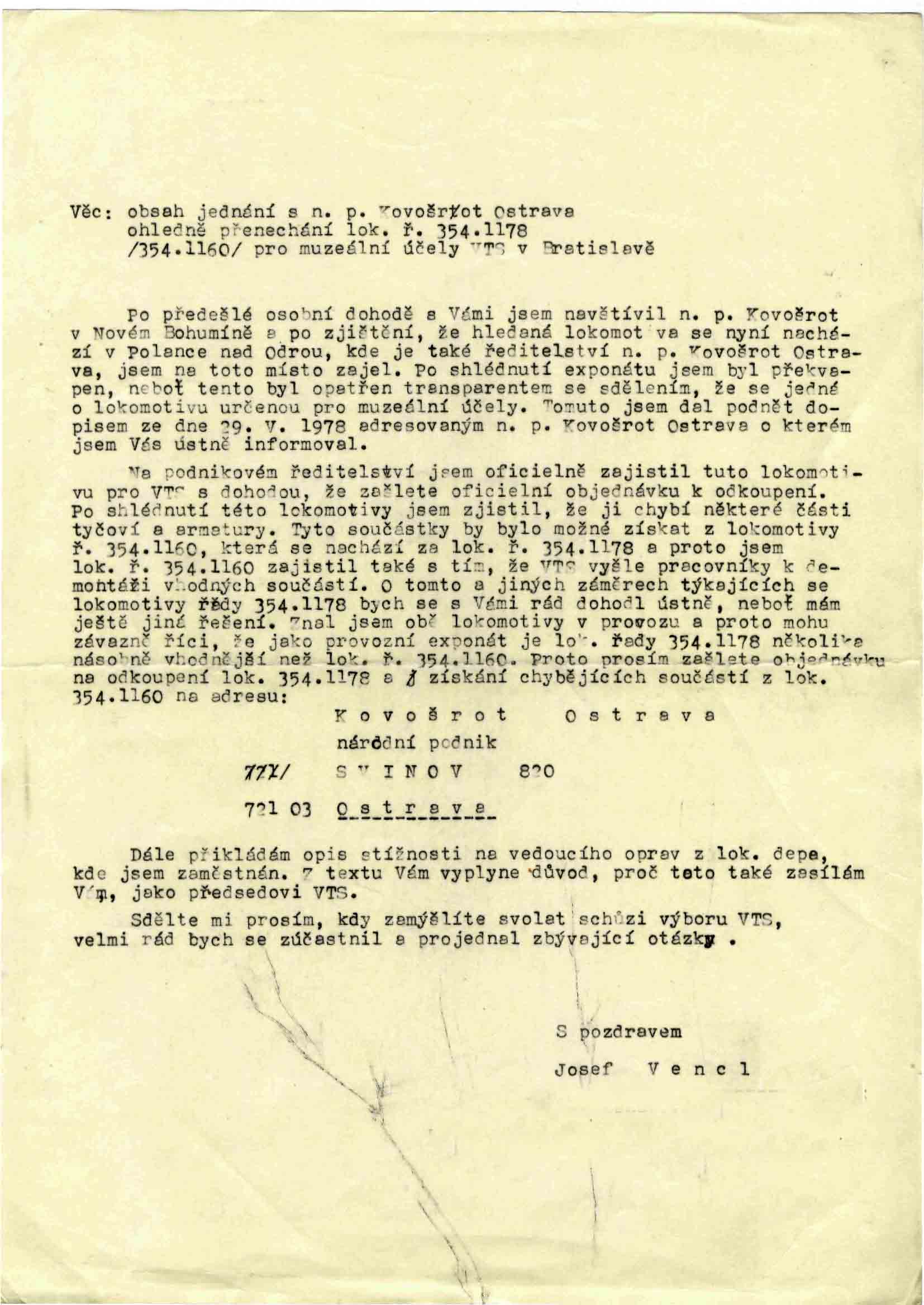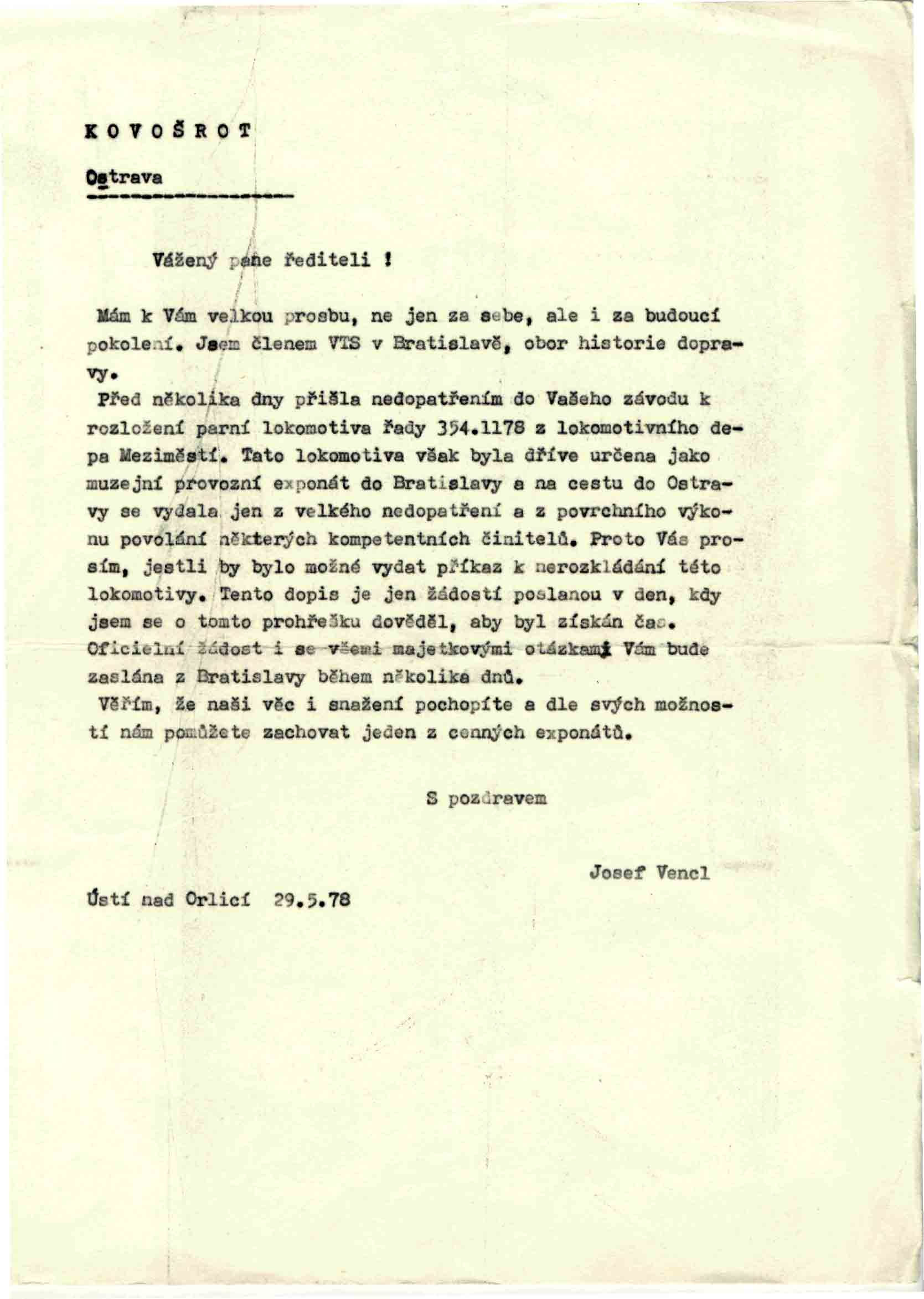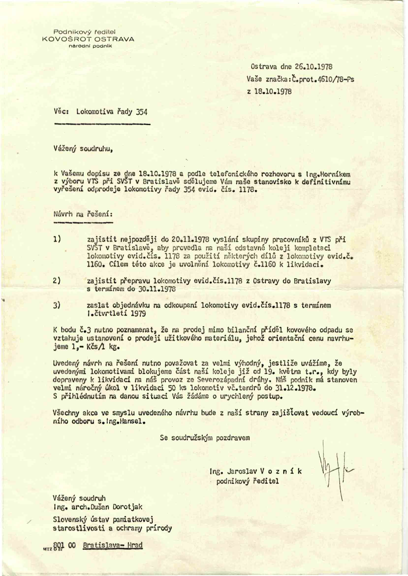 Keď sa už zdal osud lokomotívy 354.1178 definitívne spečatený, začína sa boj o jej záchranu a ďalšie využitie pre muzeálne účely. Počiatky úsilia o záchranu lokomotívy snáď najlepšie zachytáva do dnešných dní dochovaný list pána Jozefa Vencla z 29.mája 1978, v ktorom sa obracia na vedenie Kovošrotu s prosbou o odloženie fyzickej likvidácie 354.1178 za účelom získania času potrebného na vybavenie všetkých náležitostí nevyhnutných k zabráneniu fyzickej likvidácie rušňa s jeho vytiahnutiu z areálu Kovošrotu. Záchrany rušňa sa od počiatku ujíma Vedecko – technická spoločnosť (VTS) so sídlom v Bratislave, s ktorou komunikuje aj pán Vencl. Po obdržaní oficiálnej žiadosti o záchranu 354.1178 zo strany VTS a telefonáte s pánom Ing. Horníkom z výboru VTS pri SVŠT (Slovenskej vysokej škole technickej) v Bratislave, píše dňa 28.10.1978 podnikový riaditeľ Kovošrotu Ostrava, pán Ing. Jaroslav Vozník oficiálny list s ponúkaným riešením záchrany lokomotívy. V liste definuje tri hlavné body a to: do 20.11.1978 skompletizovať 354.1178 s využitím dielov z 354.1160, do 30.11.1978 zabezpečiť prepravu lokomotívy z Ostravy do Bratislavy, zaslať objednávku na odkúpenie 354.1178 s termínom 1. štvrťroku 1979. Na základe tohto listu sa písomne 9.11.1978 obracia pán Ing. Horník na pána Vencla s prosbou o návštevu Kovošrotu a kompletizáciu 354.1178. Pán následne Vencl zabezpečil kompletizáciu rušňa a jeho presun z Kovošrotu do areálu Lokomotívneho depa Ostrava, niekedy v roku 1979. Presun rušňa sa uskutočnil pravdepodobne na základe ústneho prísľubu, že Kovošrotu Ostrava bude hodnota rušňa (60 000,- Kčs) uhradená Považským múzeom v Žiline, ktoré v tej dobe spolupracovalo pri záchrane parných rušňov na Slovensku. S touto podmienkou sa uskutočnila aj podmienečná preprava rušňa z Ostravy do Žiliny (t. zn. že ak nebude Kovošrotu uhradená cena rušňa, bude zlikvidovaný v Žiline). Prvý pokus o presun rušňa z Ostravy do Žiliny bol realizovaný začiatkom roku 1980, avšak bol neúspešný. Bližšie o tomto pokuse píše vo svojich poznámkach Ing. Jiří Kubáček CSc., ktorý vtedy do Ostravy po 354.1178 prišiel. Preprava sa napokon podarila zorganizovať kontrolnému dispečerovi SVD Bratislava Jánovi Kilianovi na jar 1980. Pravdepodobne 11.5.1984 bol rušeň dopravený do starého depa Bratislava východ I potom, čo Múzejno-dokumentačné centrum (MDC) zabezpečilo majetkoprávne vysporiadanie s Kovošrotom Ostrava, keďže Považské múzeum v Žiline na túto vec zjavne rezignovalo. V tomto roku MDC rušeň zaradilo do svojich zbierok, čím sa z neho stala štátom chránená národná kultúrna pamiatka, ktorou je dodnes. V roku 1990 sa plánovala oprava rušňa v RD Zvolen, ktorá sa však napokon nezrealizovala. Z Bratislavy rušeň odišiel do Vrútok spolu s ďalšími rušňami pravdepodobne roku 1997. Vo Vrútkach pán Ivan Hašta zabezpečil konzerváciu rušňa a nastriekanie čiernou farbou. Z Vrútok sa v roku 1999 dostal do Zvolena, kde sa ho za účelom opravenia do prevádzkyschopného stavu ujal KHT. Pred samotnou prepravou rušňa do Zvolena, bola vykonaná jeho obhliadka členmi KHT, pri ktorej bol zistený nasledovný stav: